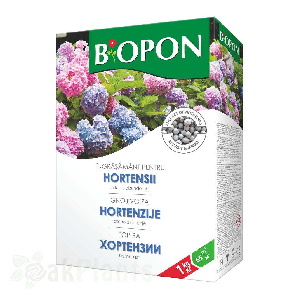 Препаратът BIOPON е разработен специално за хортензии, но може да се използва и за други киселолюбиви декоративни храсти. Формулата поддържа оптималното pH и предотвратява хранителни дефицити.Опаковката от 1 кг е достатъчна за няколко растения през сезона. Съхранявайте на сухо място, далеч от деца и домашни любимци.В Oakplants.EU предлагаме гранулиран тор BIOPON, съобразен с реалните нужди на хортензиите за здрав растеж и устойчив цъфтеж. 🌸Колко често трябва да прилагам гранулиран тор BIOPON за хортензии?