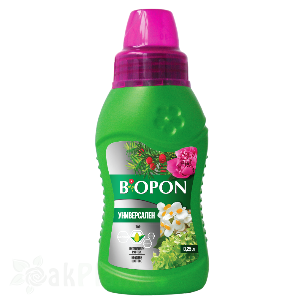 Течен тор универсален BIOPON е концентриран разтвор за подхранване на всички видове растения в градината и дома. Продуктът осигурява балансирано съотношение на основните хранителни елементи и микроелементи, необходими за здрав растеж.
