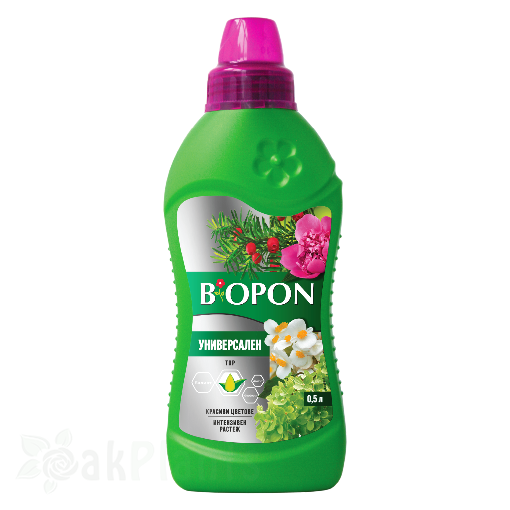 Течен тор универсален BIOPON е концентриран разтвор, който осигурява пълноценно хранене за всички видове растения. Един флакон от 0.5л е достатъчен за приготвяне на 75 литра готов разтвор.