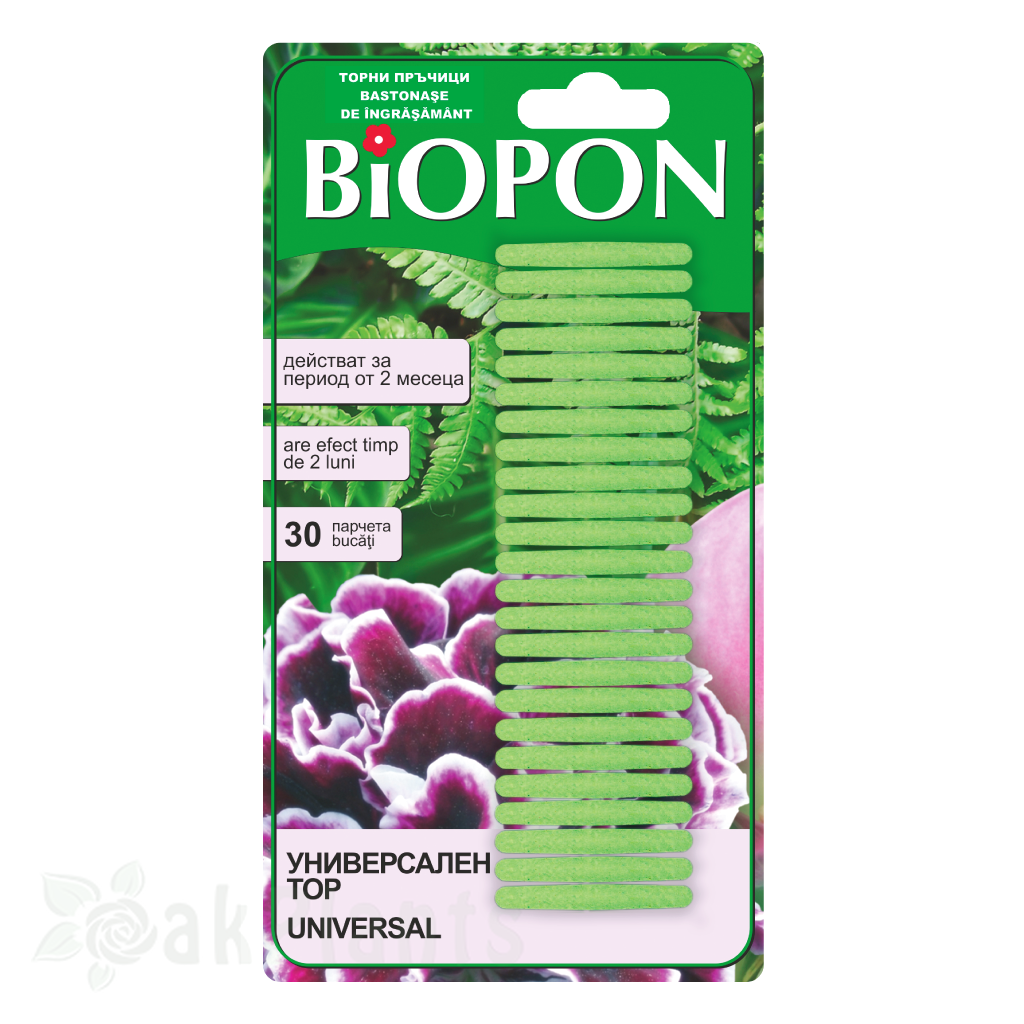 Универсалните торни пръчици BIOPON осигуряват балансирано подхранване за широк кръг растения – декоративни, плодни, зеленчукови и саксийни видове. 🌿 Формулата NPK 10:6:6 съчетава азот, фосфор и калий в пропорции, които стимулират растежа, укрепват корените и подобряват цъфтежа.Пръчиците се поставят директно в почвата и постепенно отдават хранителни вещества. Това осигурява дълготрайно подхранване без риск от презаситване.Състав и хранителни елементи